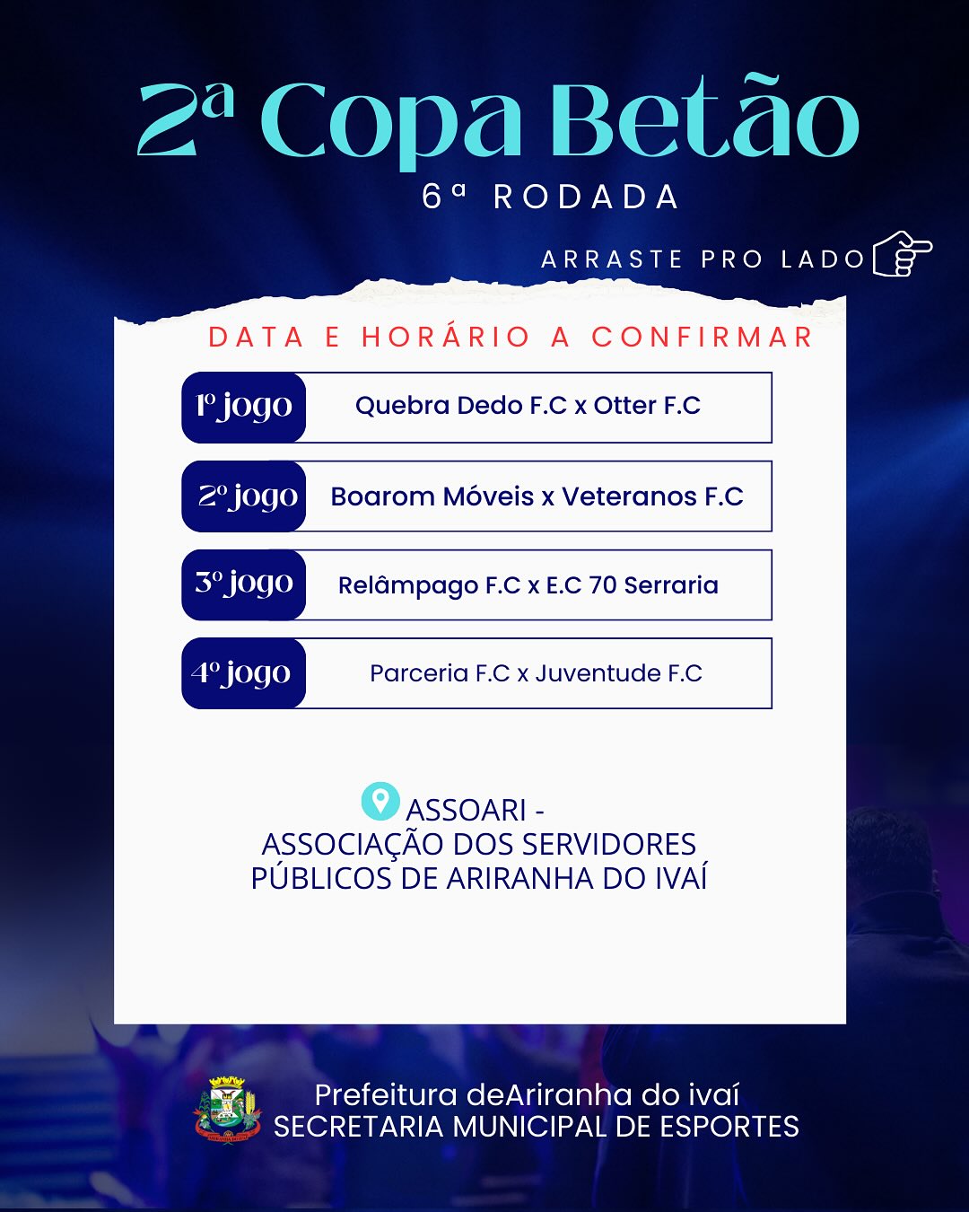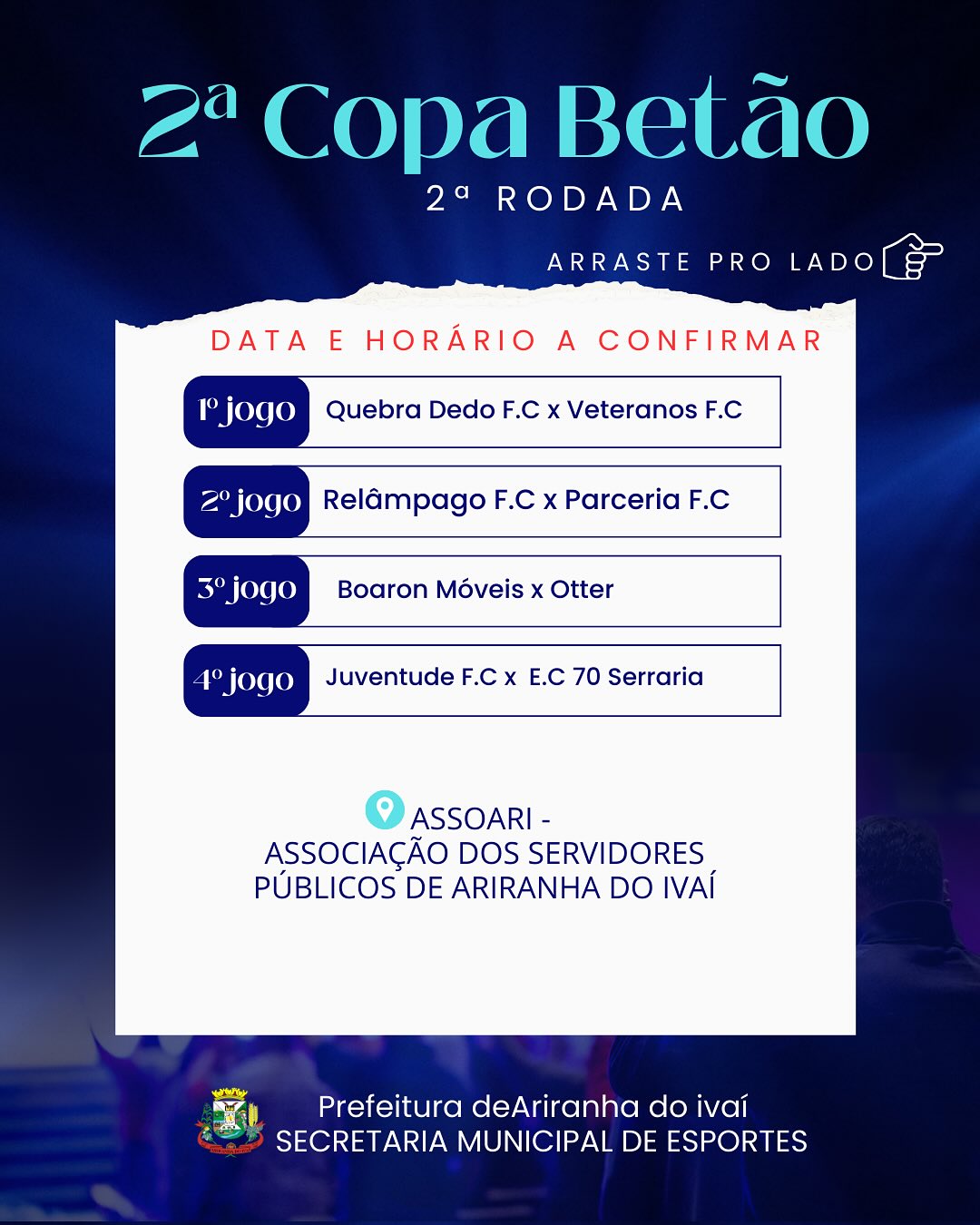 A emoção do futebol vai tomar conta de Ariranha do Ivaí! No próximo domingo, 7 de setembro, tem início a 2ª Copa Betão de Futebol, no Campo da Associação dos Servidores Públicos (ASSOARI). As datas e horários serão só pra essa primeira rodada. As rodadas só estão confirmados os confrontos, mas dia e horário ainda não foram definidos.