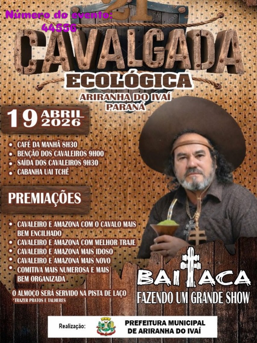 Participe! Traga sua família, reúna sua comitiva e venha viver esse grande momento de tradição, cultura e confraternização em Ariranha do Ivaí! E ATENÇÃO AO NÚMERO DO EVENTO: 44556