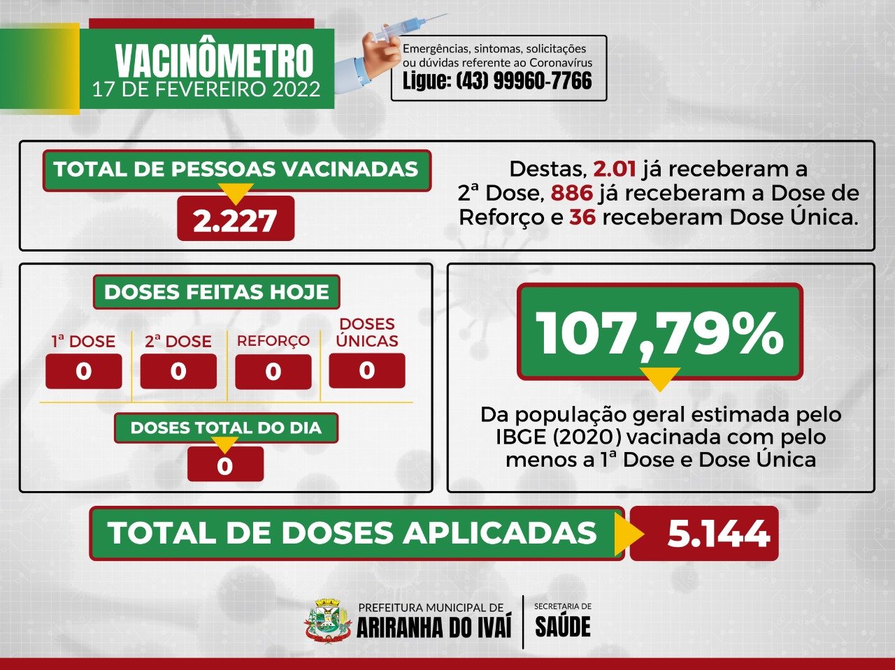 A Secretaria Municipal da Saúde de Ariranha do Ivaí/PR informa que até esta Quarta-Feira, 23 de Fevereiro, foram imunizadas 2.227 pessoas contra a Covid-19, 107,79% da população geral estimada pelo...