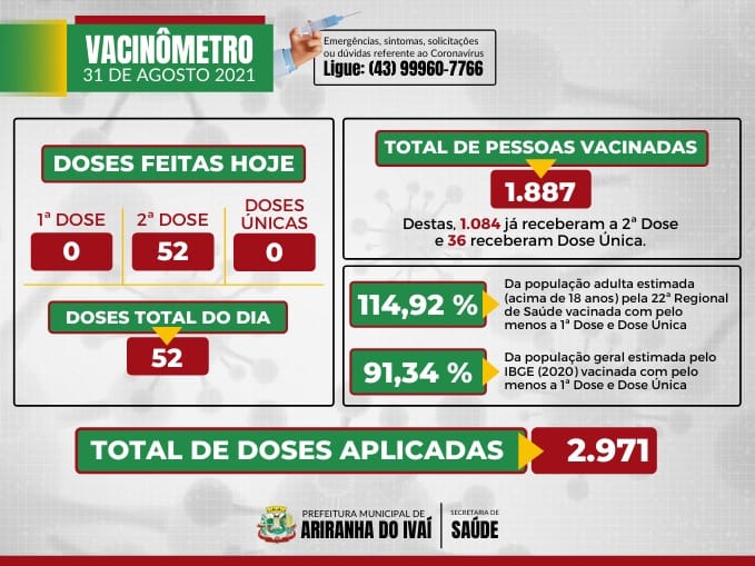 A Secretaria Municipal da Saúde de Ariranha do Ivaí/PR informa que até esta Quarta-Feira, 08 de Setembro, foram imunizadas 1.905 pessoas contra a Covid-19, 116,02% da população adulta estimada pela...