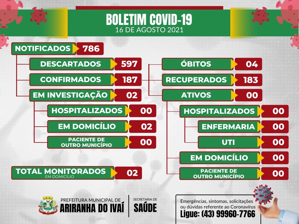 A Secretaria Municipal de Saúde de Ariranha do Ivaí/PR, vem informar a população o Boletim atualizado da evolução da Covid-19 em nossa cidade. Confira os dados desta Sábado, 21 de...